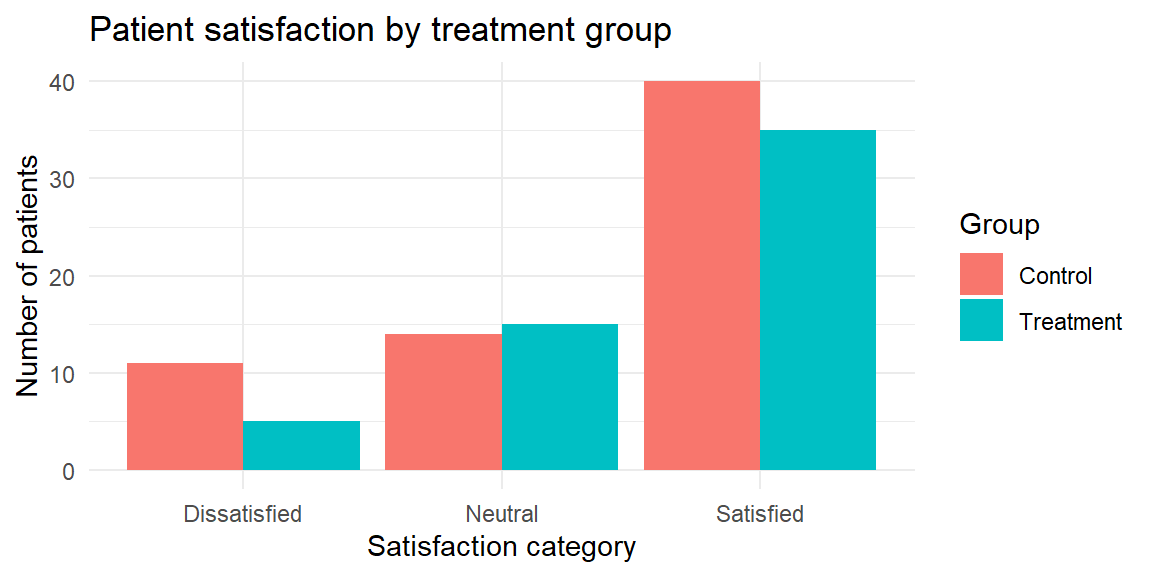 A clustered (side‑by‑side) bar chart groups bars for each level of a second variable next to each other so you can compare across groups. For example, imagine you survey 120 patients about how satisfied they were with a new physical therapy program (satisfied, neutral, dissatisfied) and record whether they were in the treatment or control group. A clustered bar chart shows differences in satisfaction between the two groups.