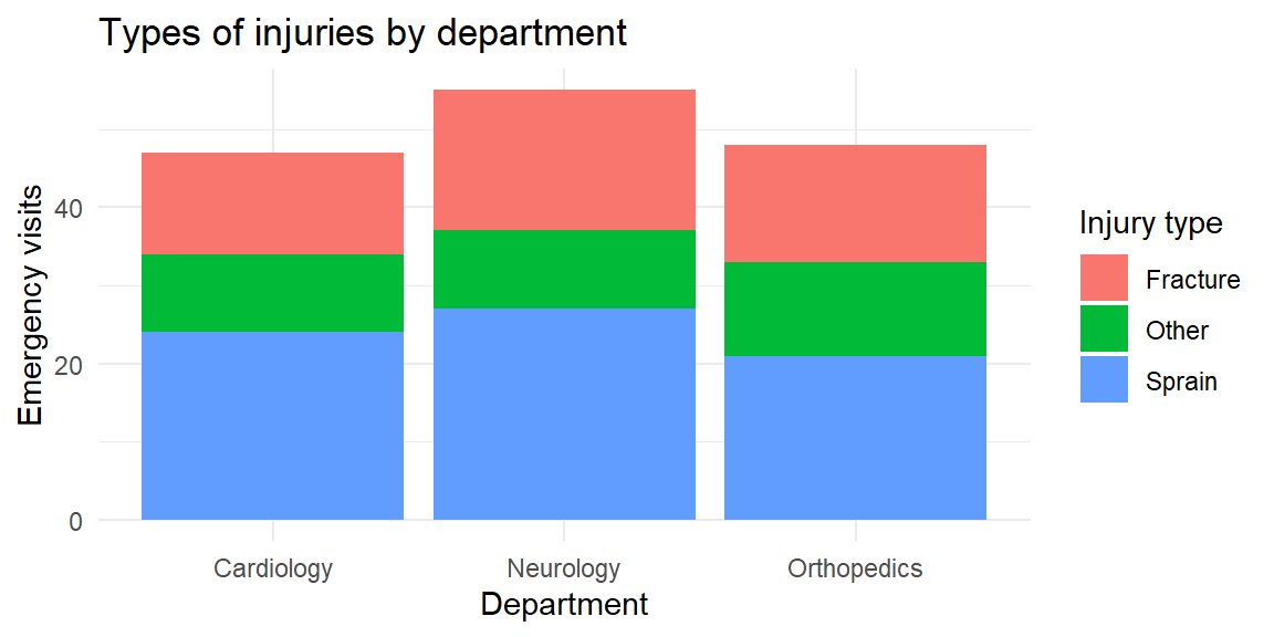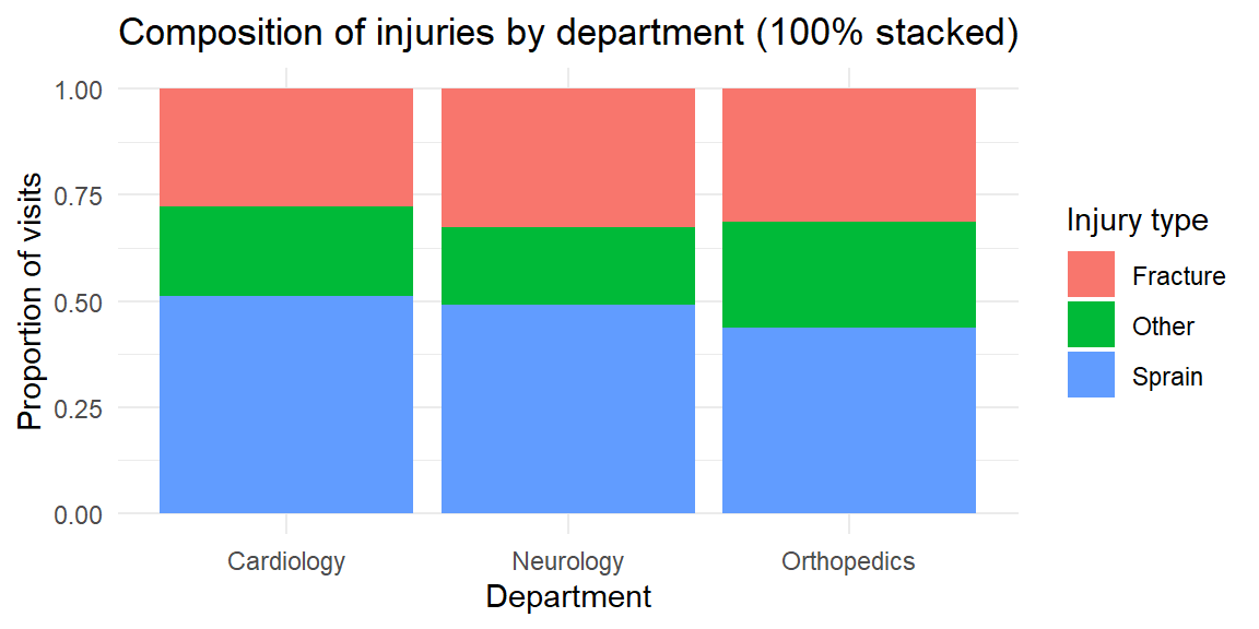 Stacked bars are useful when you care about the total across categories, but they hide patterns in the middle segments. In the last plot, you can easily compare the overall emergency visits across departments and the share of fractures, but it’s harder to compare the “other” injuries across departments because their segments float at different heights. If your goal is to compare subgroups, a clustered bar chart is usually better.