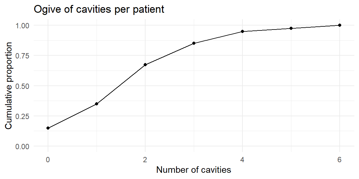 Choosing class width for count data. Decayed teeth are counted in whole numbers, so using a class width of 1 preserves each distinct count (0, 1, 2, …) and yields an easy‑to‑interpret distribution. If the counts range widely or if some counts are rare, a wider class width (e.g., grouping 4–6 teeth together) could reduce sparsity and simplify the table.