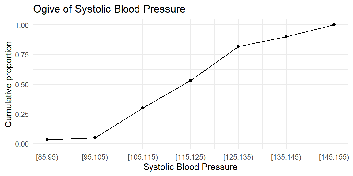 | Ogive | A graph of cumulative frequencies or cumulative relative frequencies versus the upper class boundary, useful for identifying percentiles. |