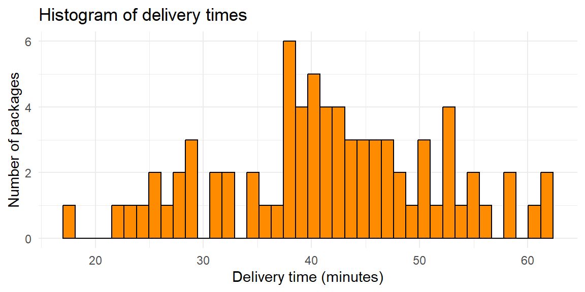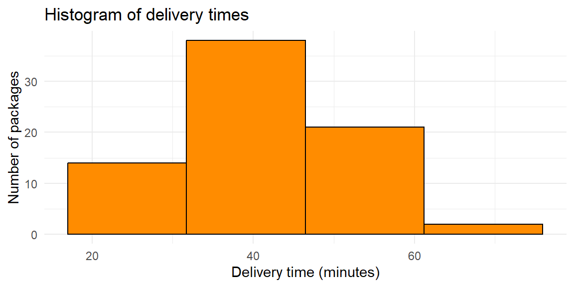 A logistics company records the delivery times (in minutes) for 75 packages delivered within a city on a given day. Delivery time is a continuous quantitative variable, so we again begin by constructing a frequency distribution.