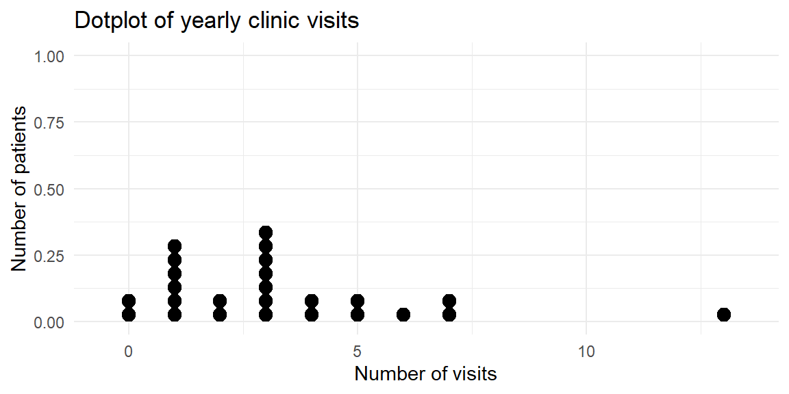 The dotplot shows that most patients had between one and three visits, while a few had no visits or as many as 13 visits. Because each dot represents a patient, the plot makes it easy to see both the concentration of values and the less common outcomes.