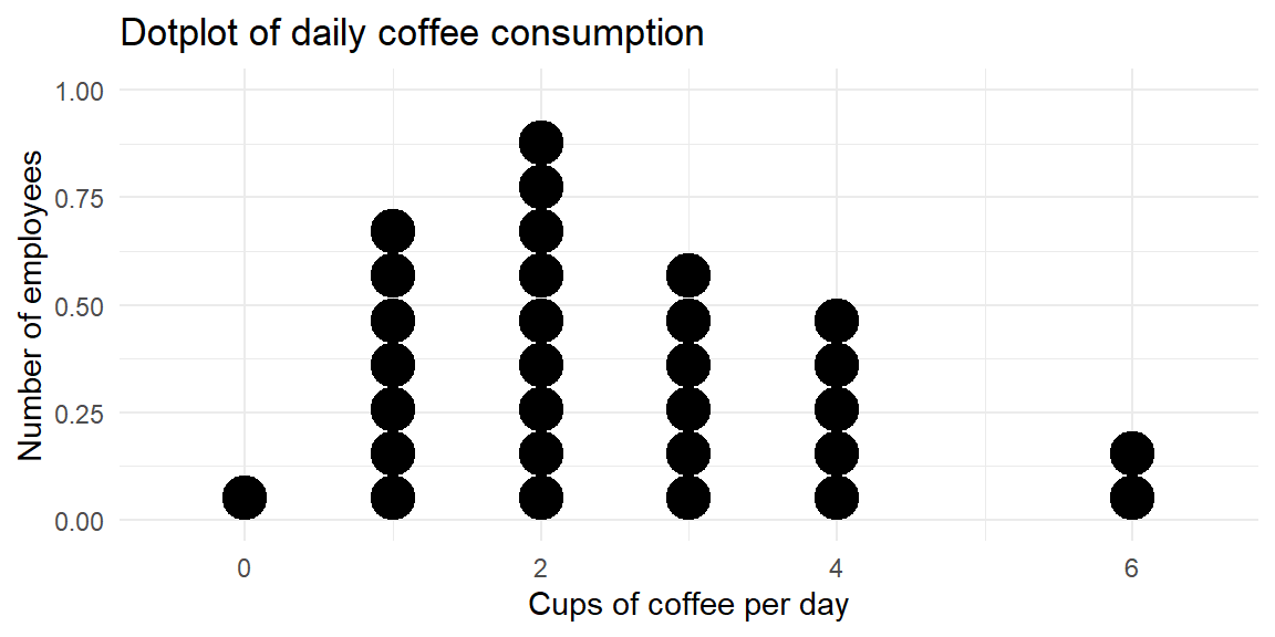 This dotplot reveals that most employees drink one to three cups per day, with a smaller number drinking four or more cups and a one employee drinking none at all. The stacked dots make it easy to compare frequencies while still seeing each individual’s value.
