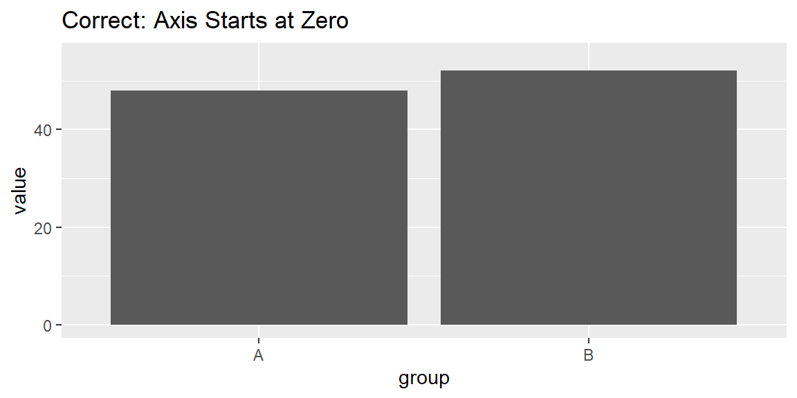 What goes wrong if you don’t: Two categories with similar values may appear drastically different, leading readers to overestimate the importance of the difference.