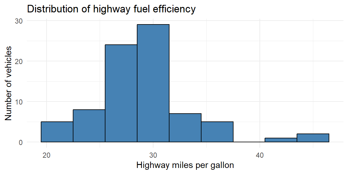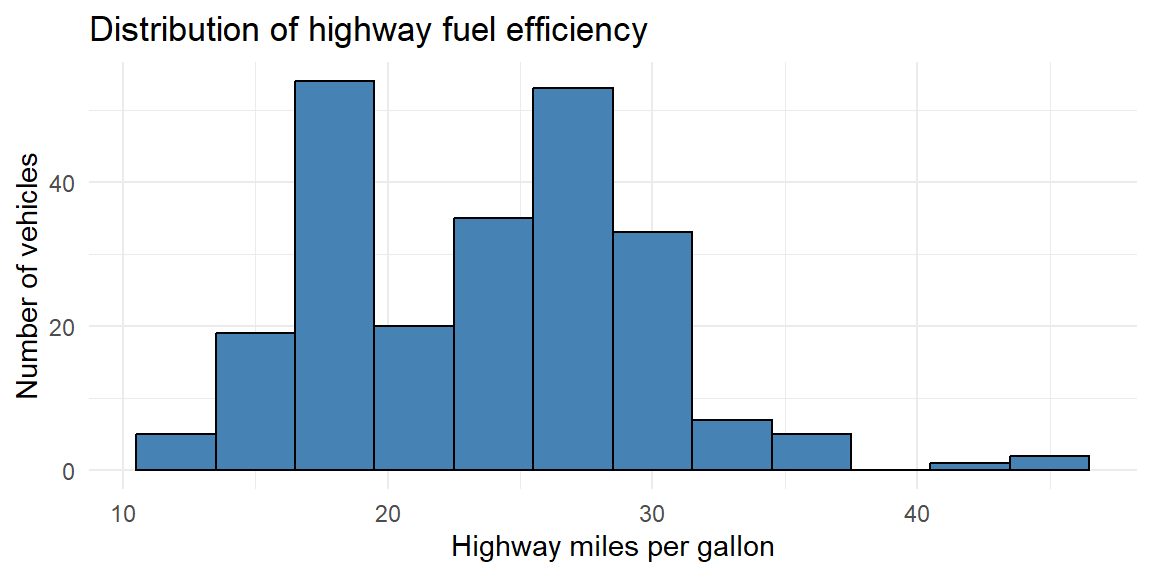 Because highway fuel efficiency is measured on a continuous scale, exact repeated values are not especially meaningful. Instead, we identify the mode as the peak of the distribution, using a histogram.