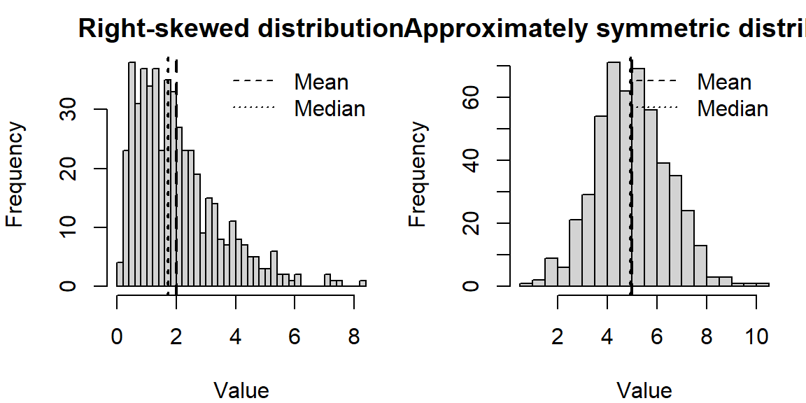 The following simulates data from a right‑skewed distribution and a symmetric distribution and plots them side by side. Notice how the mean and median behave.