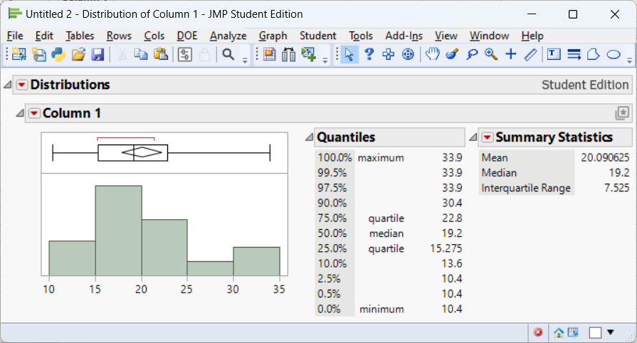 - The five‑number summary is visible in the Analyze→Distribution output. Click the red triangle ▶ next to the variable and choose Nonparametric→Quantiles to list the quartiles. JMP labels the minimum and maximum directly in the summary.